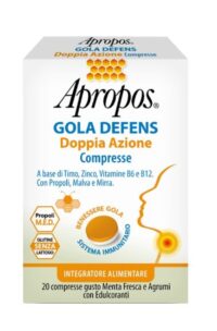 Apropos Gola Defens C Pastiglie, grazie al complesso barriera APM, crea un film mucoadesivo ad effetto barriera, che protegge la mucosa orofaringea dall’attacco di agenti esterni dannosi, idratandola e svolgendo così un’azione lenitiva.